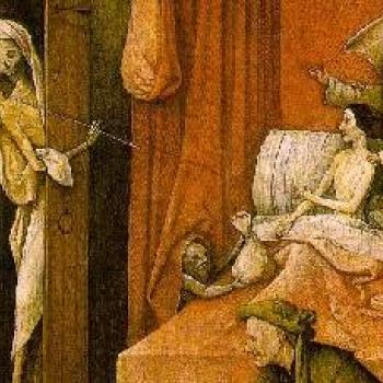 Painted in 1485 by Hieronymous Bosch, Death and the Miser is an allegorical work of art that reflects the impact of religion and disease on European society during the Middle Ages. The painting focuses on an old miser dying in his bed and staring at a shrouded skeleton walking through the door. The same miser is depicted again at the bottom of the painting as a younger and healthier man placing coins into a lockbox.