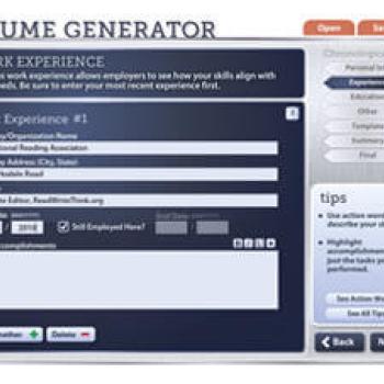 This online tool guides students through the creation of a resume. Saving capability allows them to return to their work and make revisions. Written and audio tips throughout the tool guide students as they complete each section of the resume.